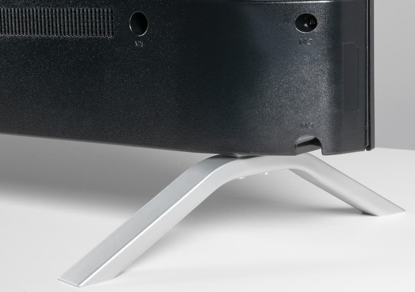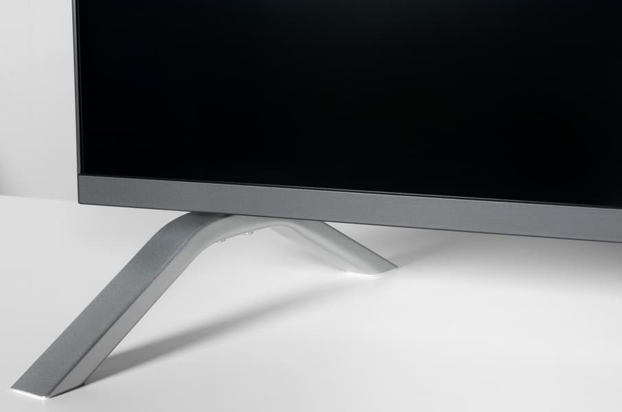 Штатная подставка модели «Яндекс ТВ Станция второго поколения» состоит из двух крупных алюминиевых ножек покрашенных порошковой краской в светло-серый цвет (под цвет нижней накладки экрана), прикрепляемых по краям нижней части корпуса устройства.