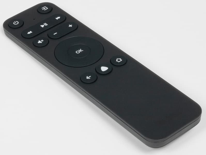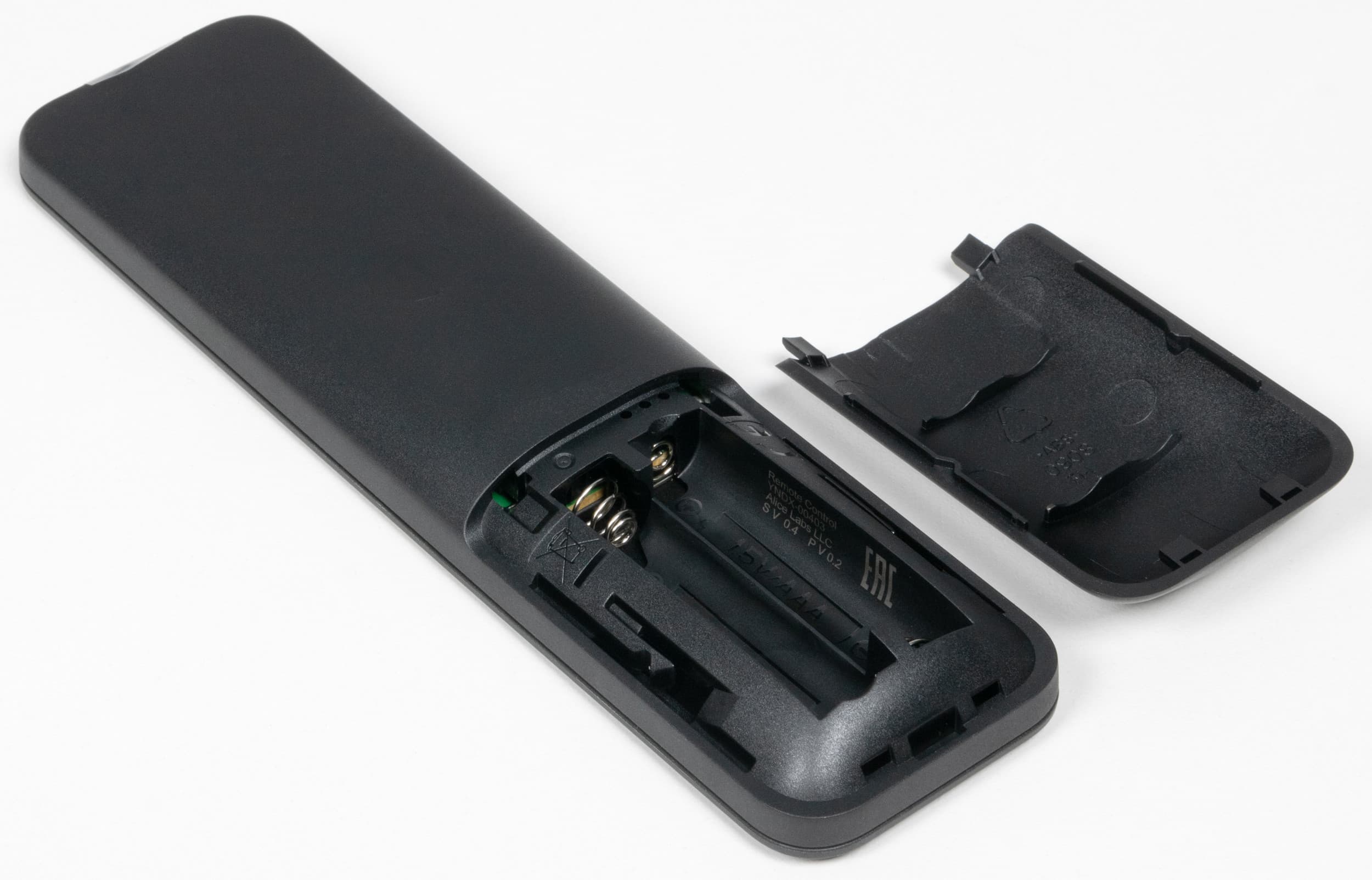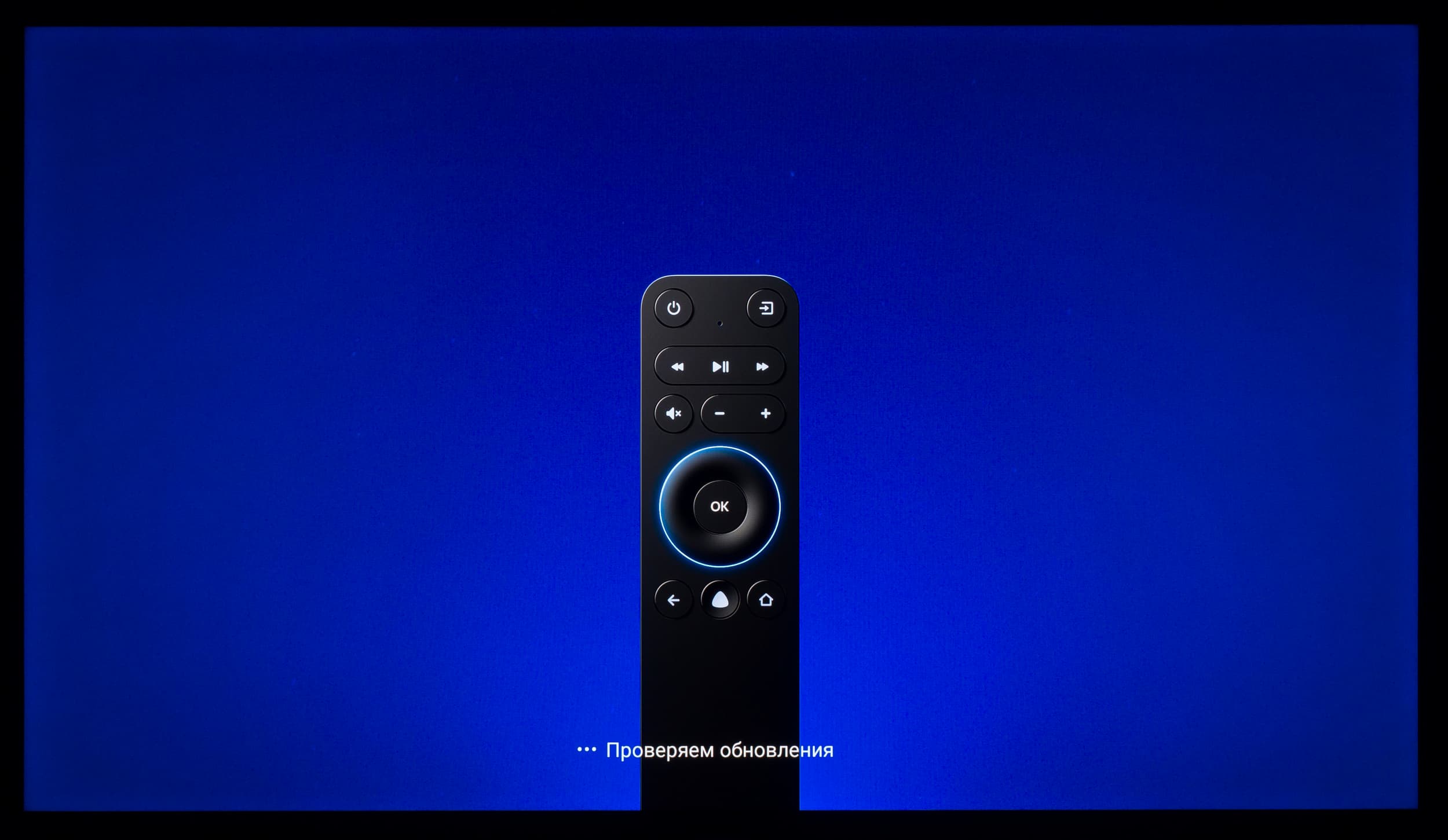 На пульте есть классический «навигационный круг» с центральной клавишей подтверждения (ОК), вспомогательные клавиши «назад» и «домой», вызов Алисы, регулировка громкости в виде горизонтальной качельки, кнопка Mute, старт/стоп, прокрутка или переход к следующему видео/аудио треку (в зависимости от приложения), вызов меню настройки.