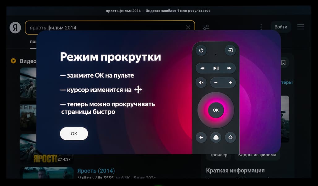Для прокрутки во встроенном «Яндекс Браузере» производитель предлагает зажать клавишу «ОК» на пульте, после чего курсор изменится на перекрестие, управлять которым можно с помощью центрального навигационного блока.