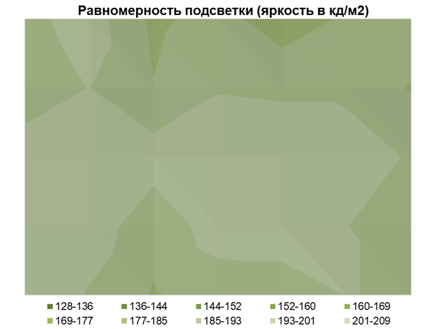 Измерения яркости проводились в 35 точках экрана, расположенных с шагом 1/6 от ширины и высоты экрана. Границы экрана не включены, настройки установлены в значения, обеспечивающие яркость белого поля в 200 нит в центральной части экрана.