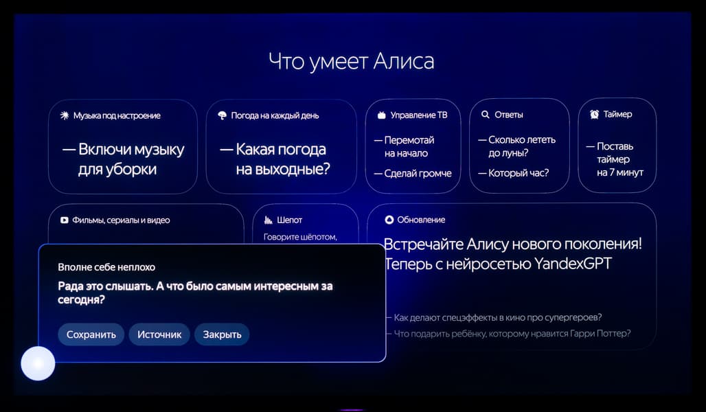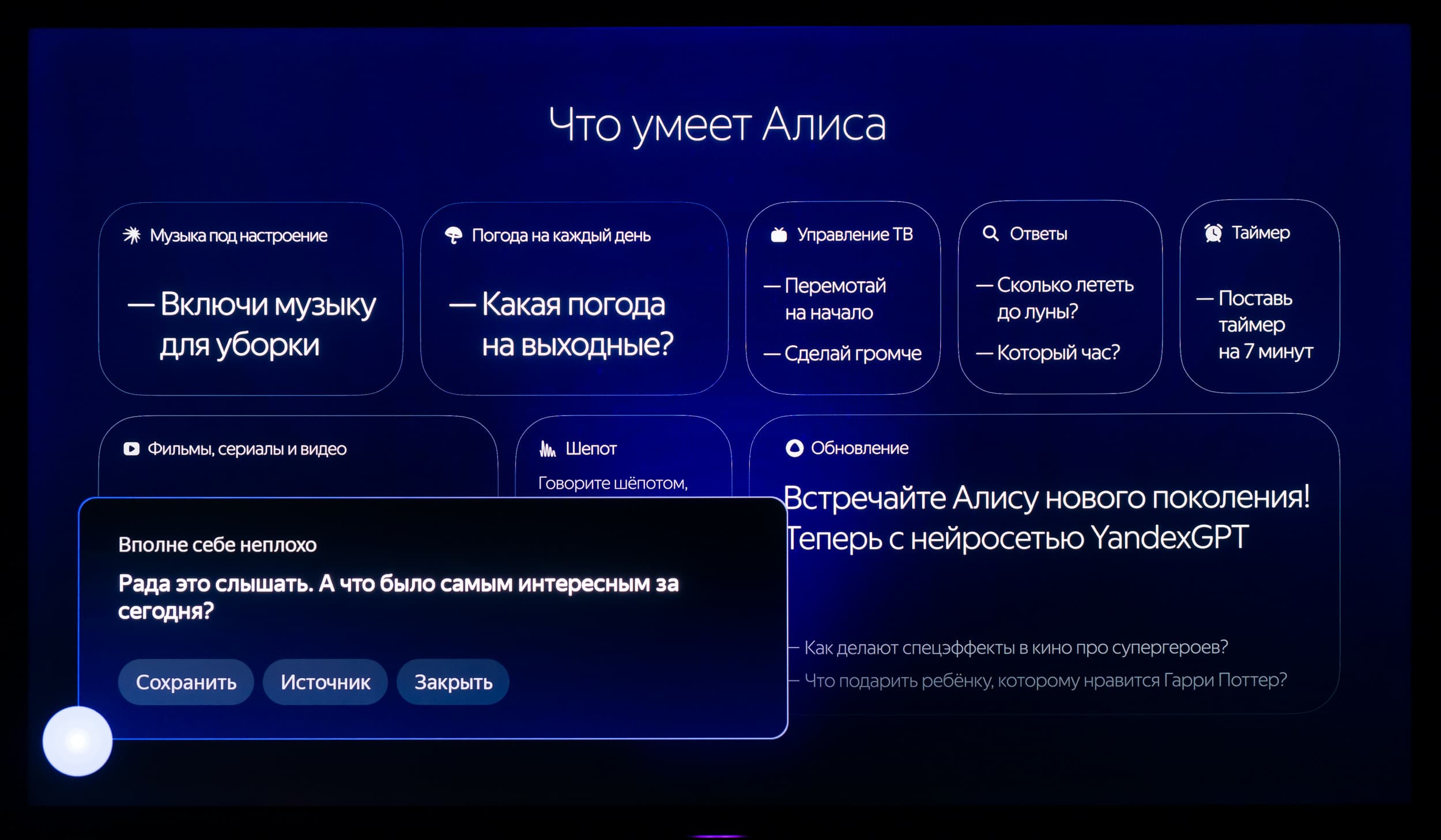 С вводом YandexGPT Алиса стала справляться с 95% запросов пользователей (такая оценка встречается на просторах рунета). Она может предоставить ссылку на источник информации, если что-то находит на определенном сайте. В случае «ТВ Станции» Алиса является не просто отдельным ассистентом, она внедрена во многие приложения и умеет ими управлять.