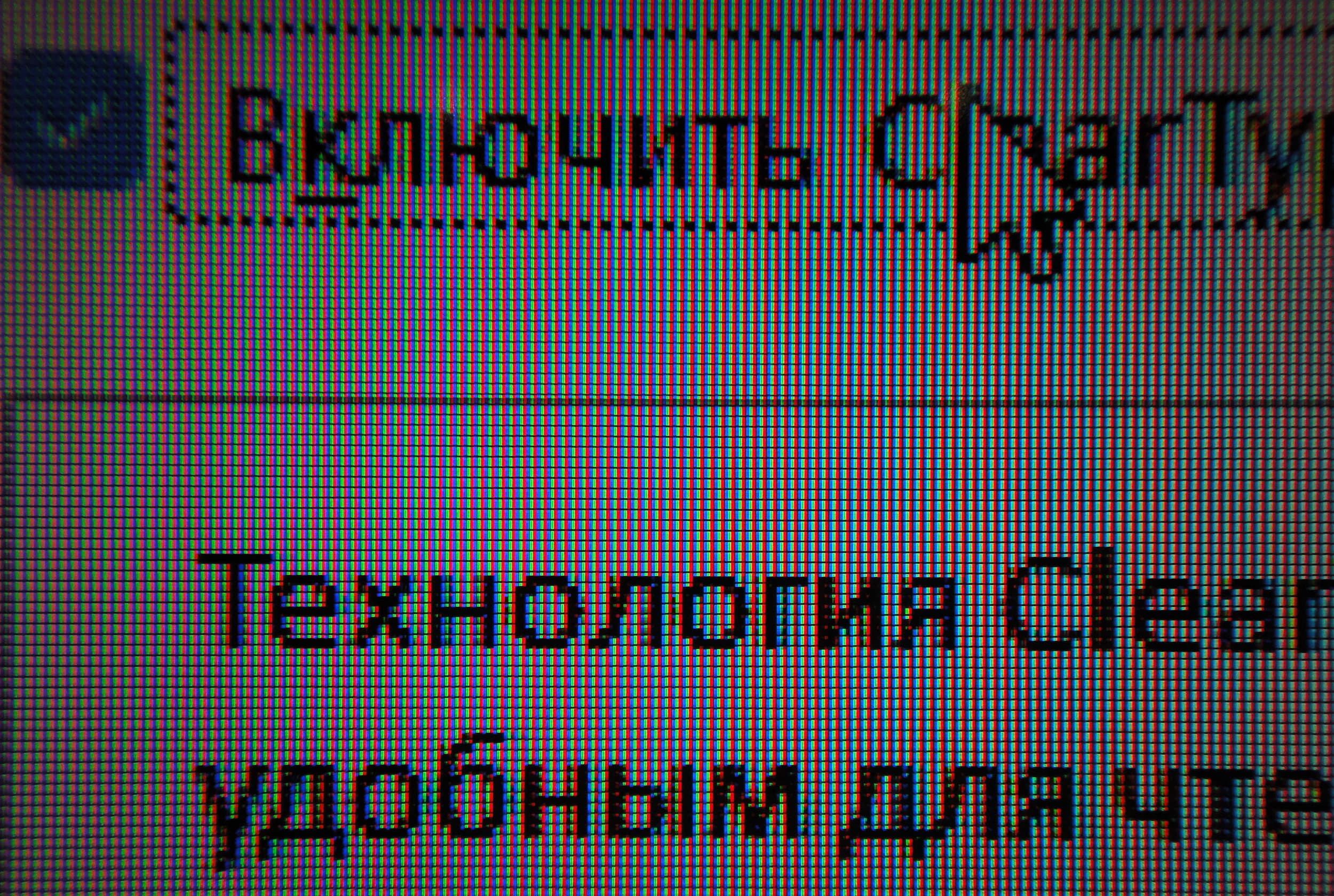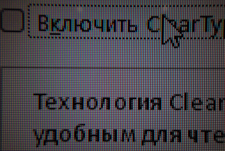 В связи с такой особенностью, так называемый кристаллический эффект фактически отсутствует, а экран визуально радует контрастной, насыщенной картинкой. Резкость достаточная (или слегка увеличенная в случае заводских настроек), проблем с выводом тонких линий и текстовых полей не отмечено. Вопросы к качеству отображения и плотности пикселей могут возникнуть только при просмотре ТВ с расстояния порядка 50—80 см (можете попробовать отключить ClearType, как на сравнительном примере выше). При увеличении дистанции до 1,2-1,5 метров и дальше картинка воспринимается плотной, без видимых дефектов.
