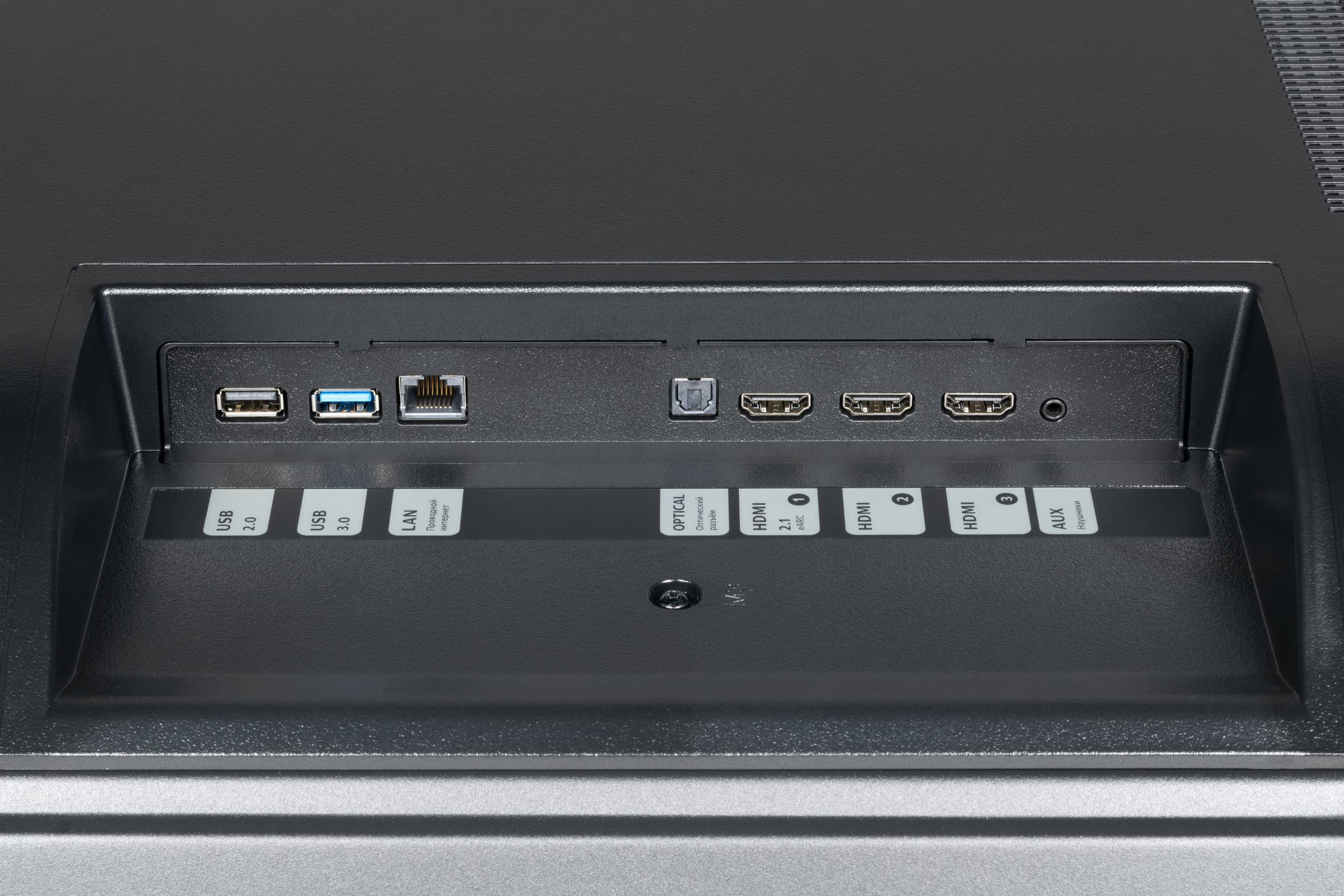 В плюсы телевизора стоит записать три входа HDMI (по заявлению производителя — два HDMI 2.0 с поддержкой 4K 60 Гц, а также одного HDMI 2.1 с поддержкой ALLM и eARC) и два USB различных версий с максимальным током до 1 А (в случае синего USB 3.0), что обеспечивает беспроблемность работы подавляющего большинства флэш-накопителей, твердотельных (SSD) и жестких (HDD) дисков. Также оба порта можно использовать для подключения слаботочной периферии (клавиатуры, мышки, USB-ресиверы) с соответствующим требованием по питанию.