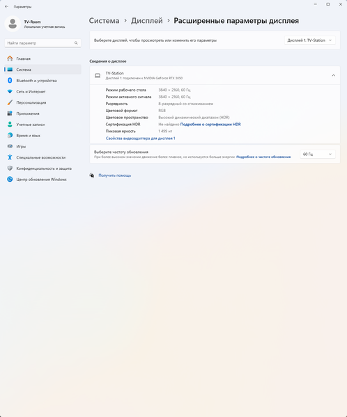 Под Windows 11 вывод в режиме HDR на данный телевизор возможен при выборе соответствующих опций в настройках дисплея. При разрешении 4K UHD и 60 Гц вывод идет в режиме 8 бит на цвет в отсутствие цветового сжатия и при полном рабочем диапазоне (0—255).