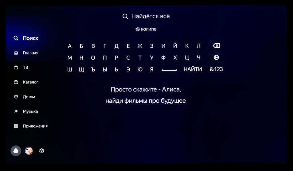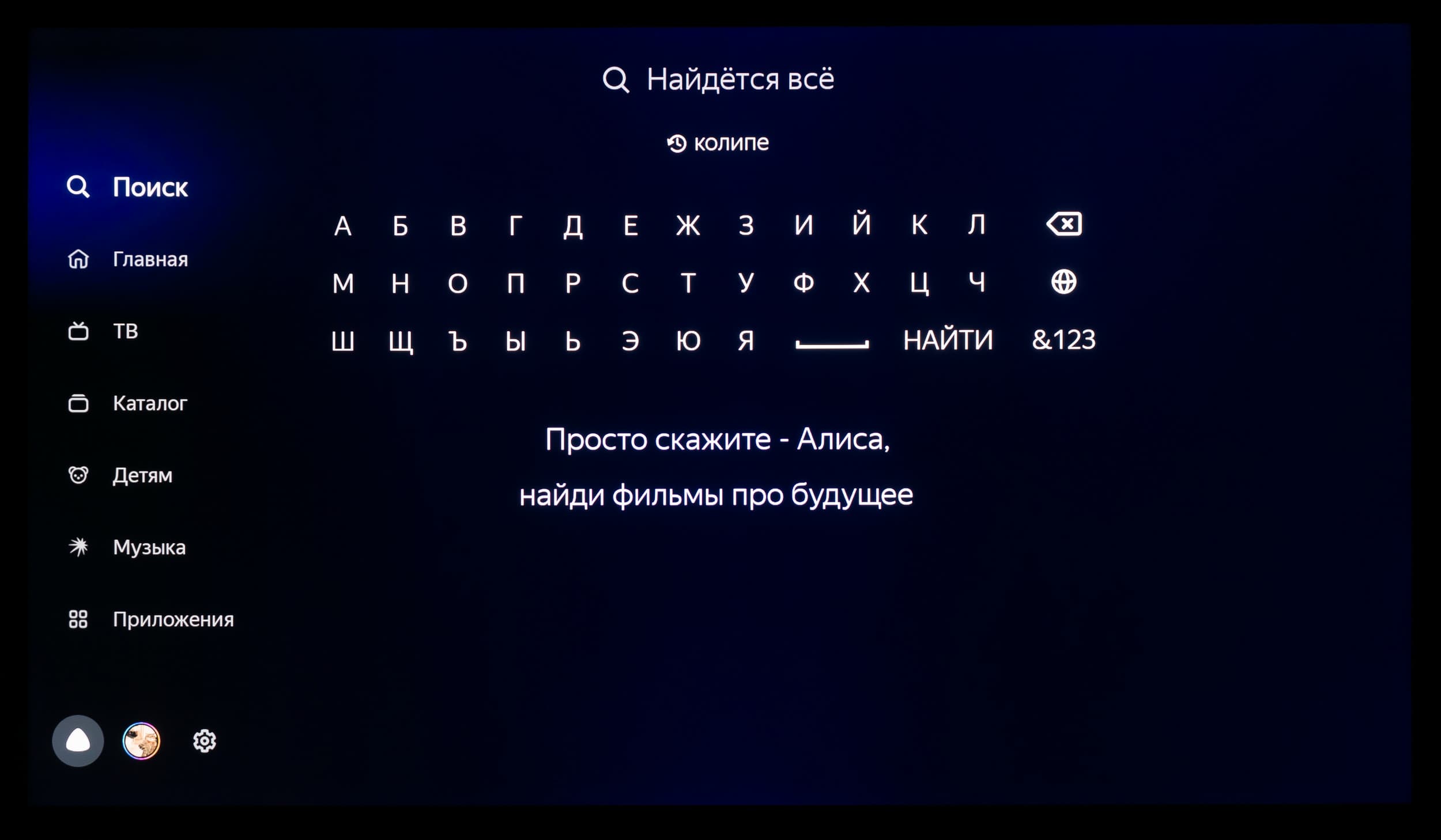 Безусловно, благодаря Алисе во многих программах работает голосовой ввод текста. Также есть полноценная интеграция с самим ТВ: например, голосом можно менять громкость, выключать/включать звук, выключать и включать ТВ (да, Алиса услышит вас даже при выключенном экране), открывать меню с настройками, выбирать нужный вход и запускать программу по ее названию, искать нужный контент (как по конкретному запросу, так и примерному — с указанием ваших пожеланий).