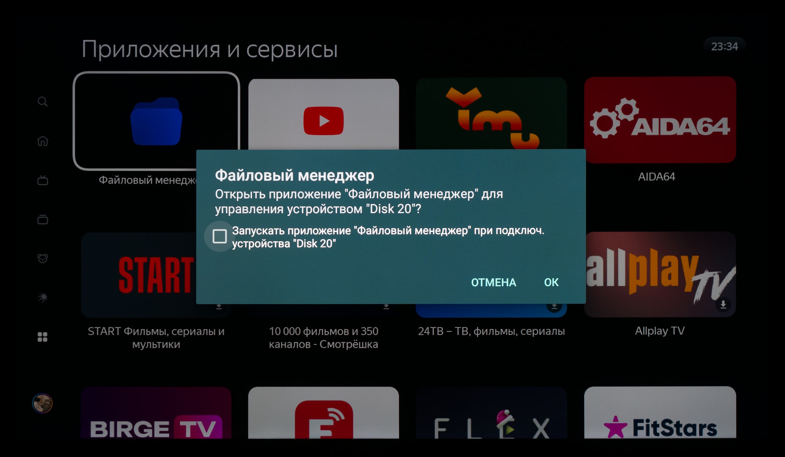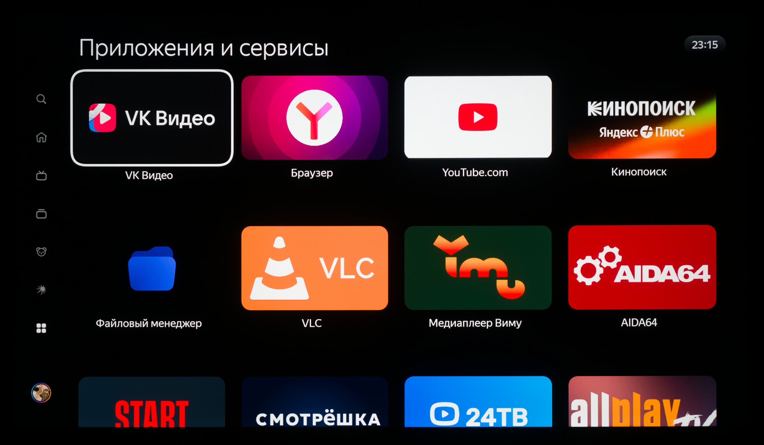 Если исключить системные, то на телевизоре предустановлены всего четыре приложения: «КиноПоиск», «Яндекс Браузер», «VK Видео», YouTube и «Файловый менеджер» (он же встроенный медиаплеер). Встроенный магазин приложений позволяет получить доступ к паре десятков популярных приложений. Также приложения, в том числе сторонние магазины, можно установить из файлов APK. Эти файлы можно записать на USB-носитель, чтобы затем установить их на телевизор с помощью уже установленного «Файлового менеджера», что мы и сделали, к примеру, для установки AIDA64.