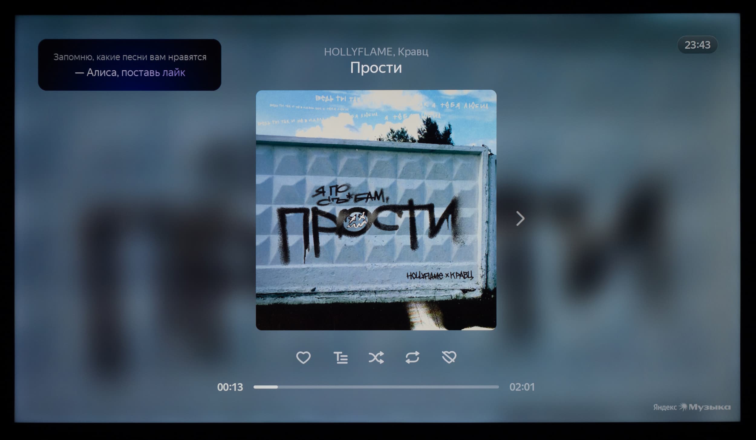Голосовой помощник Алиса запускается при однократном нажатии на соответствующую кнопку либо по обращению к Алисе при активной функции постоянного доступа ко встроенным в сам телевизор микрофонам Far field, без каких-либо необходимых действий на пульте ДУ. Микрофоны отличились высокой чувствительностью, обработка обращений на расстоянии до 4-5 метров от ТВ в тихом помещении не вызывала нареканий.