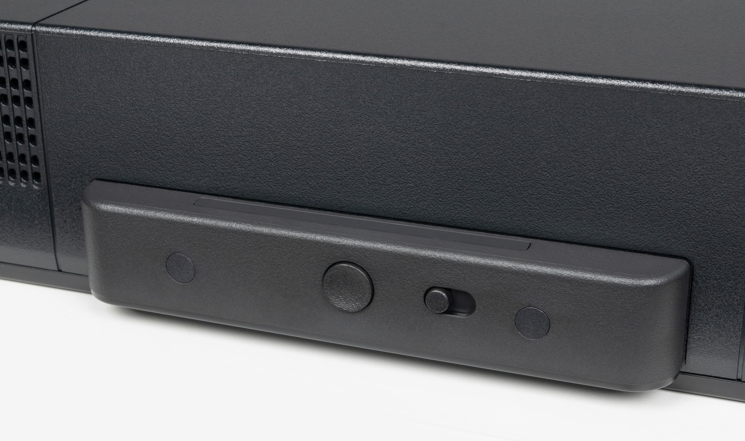 Снизу на блоке есть единственная клавиша управления, отвечающая за включение, выключение и перевод телевизора в режим ожидания (сон, с помощью короткого нажатия), а также физический переключатель системы Far field — сделано на тот случай, если вы не хотите, чтобы система постоянно вас подслушивала.