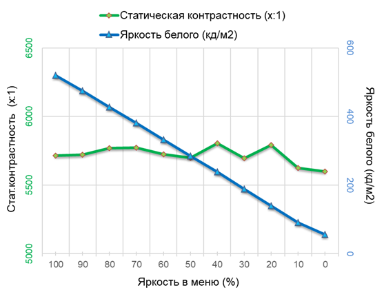 Максимальный коэффициент статичной контрастности в случае новинки составил от 6500:1 до 7600:1 в зависимости от выбранного режима изображения, что лишь подтвердило использование *VA-матрицы. После калибровки со значительными правками RGB сигнала для приведения точки белого в норму (6500 К) коэффициент контрастности снизился до 6400:1, но в ходе продолжительного прогрева устройства снизился до 5700:1, что всё еще выше заявленного в ТХ и является очень хорошим результатом. Переход к HDR результаты не меняет.
