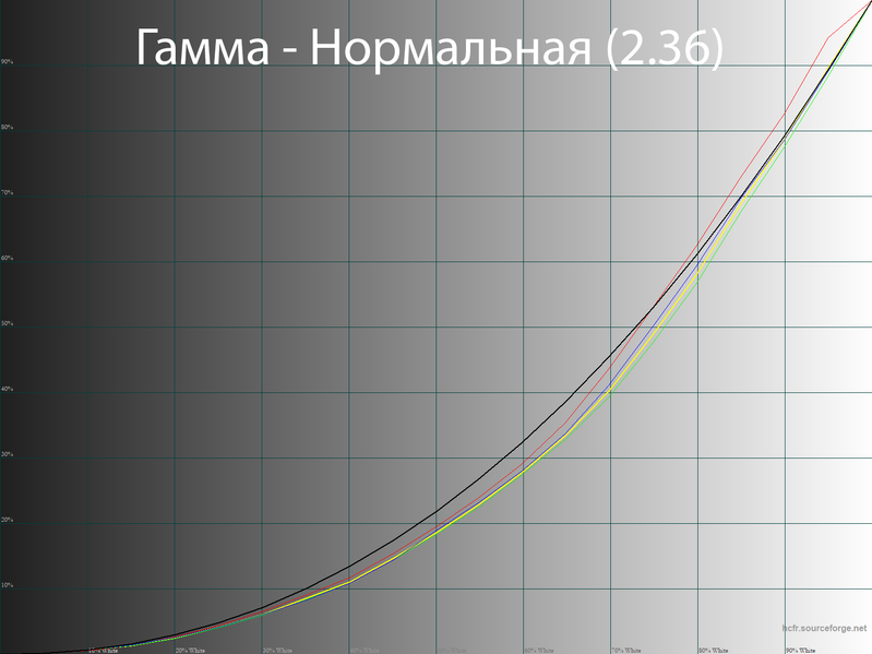 Для быстрой настройки, в отсутствие необходимости использовать подключение к ПК, потребитель может воспользоваться доступными режимами «Гамма», быстро корректирующими реальный контраст изображения. Среди доступных режимов по умолчанию выбран «Нормальная». Для некоторых потребителей он может показаться излишне контрастным (для автора это именно так). Следующий за ним режим «Темная», как выяснилось, используется для режима Кино — среднее значение гаммы 2,58.