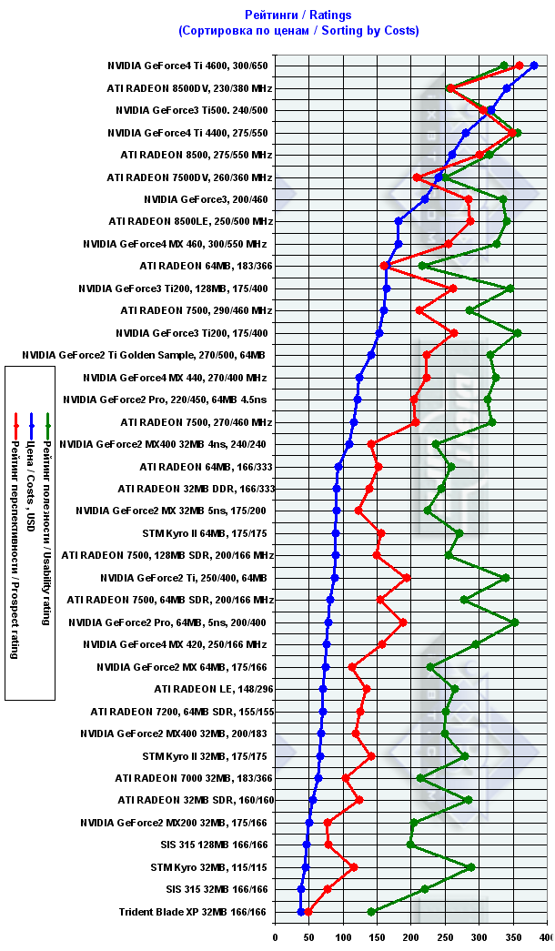 - сводные диаграммы по видеокартам стоимостью свыше $80 на базе стендов на Pentium 4 2100 MHz и Athlon XP 2000+.