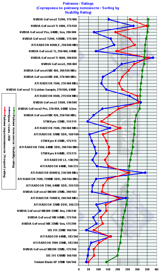 | NVIDIA GeForce4 MX 460 64MB DDR 3.6ns (300/550 MHz) | РЕКОМЕНДОВАННАЯ | 180 | 325 | 254 |
