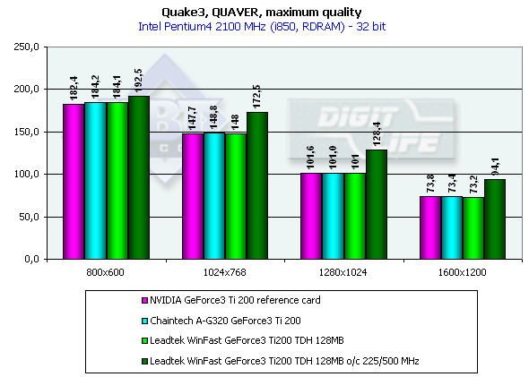 Тестирование на примере Quaver проводилось в режиме 32-битного цвета при максимально возможной детализации и с усилением сложности геометрии (r_subdivisions "1" r_lodCurveError "30000"). Этот бенчмарк очень нагружает акселераторы не только геометрией, но и огромным объемом текстур, а также массовостью эффектов.