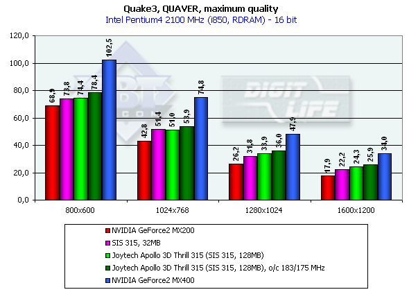 Обратите внимание на то, как сильно отстают эти карты от полноценного RADEON 7500! Плата на базе GeForce2 MX400 хоть и показала чуть худшие результаты, но они почти на уровне Joytech Apollo RADEON 7500 SDR. Поэтому популярность таких «обгрызков» будет полностью зависеть от цен на эти платы.