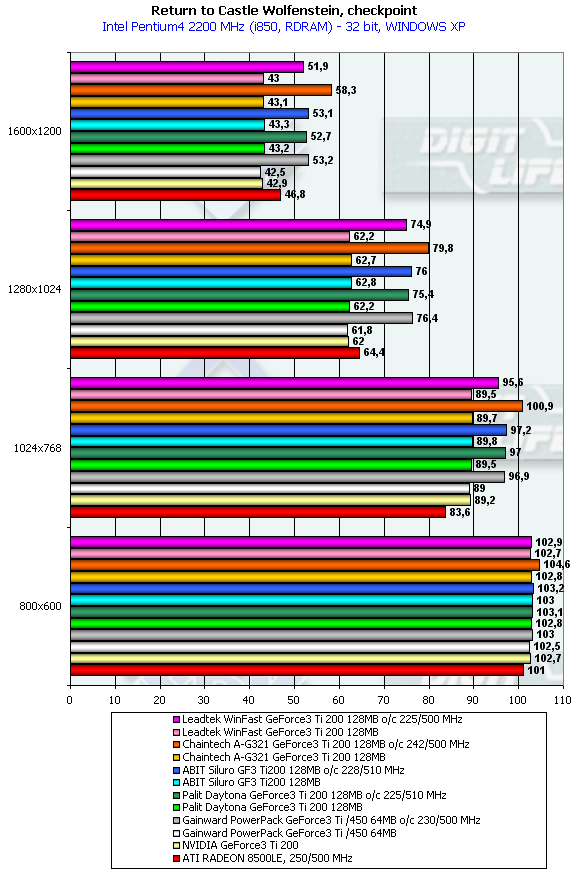 - Return to Castle Wolfenstein (MultiPlayer) (id Software/Activision) — OpenGL, мультитекстурирование, Checkpoint-demo, настройки тестирования — все на максимально возможном уровне, S3TC OFF, конфигурации можно скачать тут