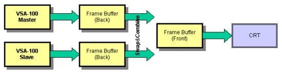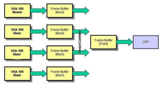 Подобно традиционной технике SLI, в новой технологии используется понятие Master-чипа (или главного чипа). При этом в конфигурациях из двух и более чипов VSA-100 один из графических процессоров является Master, а остальные — Slave. Комбинирование результатов работы нескольких чипов — фактически содержимого их кадровых буферов — происходит в порядке очереди в кадровом буфере Master-чипа, откуда и происходит вывод данных на экран монитора. Заметим, что могут комбинироваться как отдельные пиксели, так и полосы, если чипы работают в режиме чередования полос, сформированные разными чипами VSA-100, в результате чего получается полный кадр, который и отображается на экране монитора. При этом пиксели, из которых состоят полосы, могут быть получены в результате работы T-Buffer, т.е. когда для формирования одного пикселя используется несколько пиксельных семплов.