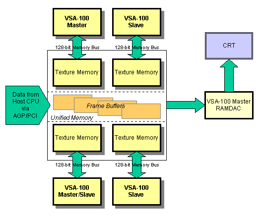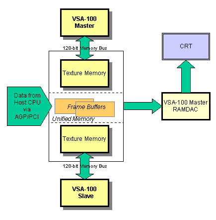 памяти, что позволяет равномерно распределить нагрузку при передаче данных и снизить требования к полосе пропускания каждой из шин. Локальная видеопамять используется следующим образом: текстуры для каждого чипа VSA-100 хранятся раздельно и являются одинаковыми, т.е. на практике происходит дублирование загруженных в локальную видеопамять текстур для каждого чипа. Все остальные данные, такие, как координаты вершин треугольников и информация о глубине (z), не копируются и едины для обоих чипов, они располагаются в общей памяти, т.н. unified memory. При этом каждый из чипов VSA-100 формирует в общей памяти собственный кадровый буфер. Каждый из двух чипов VSA-100 осуществляет формирование готовых пикселей в своем кадровом буфере (точнее, рендеринг происходит во вторичном буфере, back buffer). Эти пиксели формируют строки кадра, из которых формируются полосы кадра. Затем полосы комбинируются в кадровом буфере Master-чипа VSA-100, потом данные передаются в RAMDAC, а оттуда в монитор и отображаются в виде пикселей на его экране.