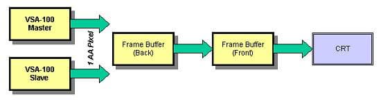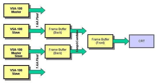 Каждый из чипов VSA-100 формирует полосы из строк кадра в своем кадровом буфере (точнее, во вторичном, или back буфере), затем данные из вторичных кадровых буферов Slave-чипов передаются во кадровый буфер Master-чипа, где и происходит их комбинирование. После чего содержимое кадрового буфера Master-чипа выводится на экран монитора. Ввиду того, что весь обмен данными между кадровыми буферами происходит внутри общей памяти (unified memory), все происходит очень быстро и не должно сказываться отрицательным образом на производительности в целом. В таком случае величина fillrate может достигать пиковых значений 664-732 млн. пикселей в режиме мультитекстурирования. Если пользователь решит использовать T-Buffer, например, для реализации эффекта FSAA, то четыре чипа VSA-100 будут взаимодействовать следующим образом.