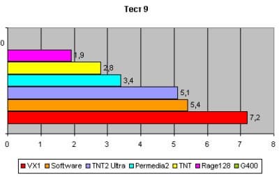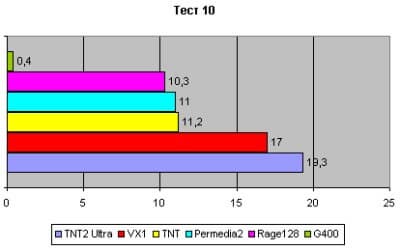 Как видно, плата на TNT2, помимо превосходных результатов в играх, лидирует среди недорогих плат и в пакете 3D Studio MAX. В 9 из 11 тестов эта плата заняла первые места, пропустив вперед плату Oxygen VX1 от 3Dlabs только в "Тест 8" и "Тест 9".