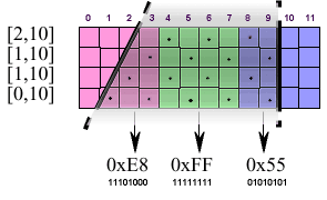 Далее вычисляются начальные и конечные точки 4-х сублиний. Пиксели, соответствующие краям треугольника, "подрезаются" получившимися сегментами. Соответствующий бит в маске устанавливается в 1 в том случае, если он попал в сегмент. Проиллюстрируем это на Рис. 3. Это фрагмент линии сканирования, пересекающей треугольник. Она состоит из четырех сублиний. Каждый отдельный малый квадрат представляет собой субпиксель. Фрагменты, состоящие из 16 субпикселей (размерностью 4х4), представляют исходные пиксели, выделены отдельным цветом и по размеру соответствуют нашей чередующейся охватывающей маске. Колонка цифр слева представляет собой начальные и конечные значения каждого сегмента. Бит в маске будет установлен в 1 в том случае, если его положение будет больше начального значения сегмента и меньше конечного. Соответствующая охватывающая маска для каждого пикселя приведена в нижней части рисунка.
