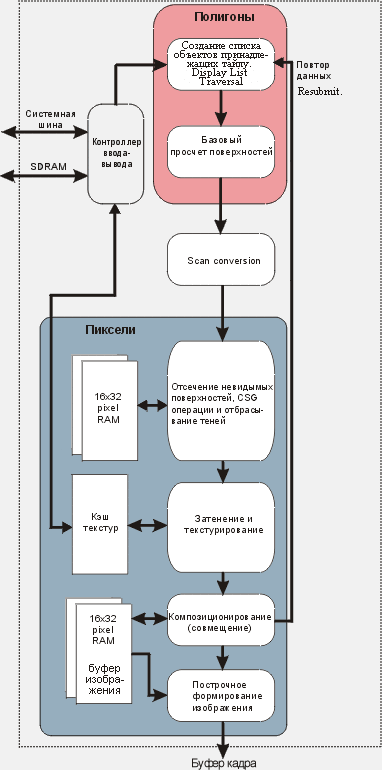 - Деление экрана на доли (тайлы) размерностью 16х32 пикселя позволяет хранить двойной Z- буфер и буфер изображения в ячейках памяти интегрированных в сам ASIC