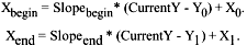 В первую очередь производится определение × координаты начальной и конечной точки пересечения базовой линии сканирования с треугольником.