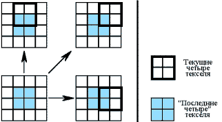 Для осуществления билинейной фильтрации пикселя берется блок из четырех соседних текселей (2х2) текстуры с центром, соответствующим прорисовываемому пикселю (выделено голубым цветом). Следующий пиксель треугольника потребует аналогичный блок из четырех текселей (выделено жирной линией). Но ввиду того, что шаг дискретизации ограничен одним пикселем, мы гарантированно получим повторное использование хотя бы одного текселя из четырех использованных для формирования предыдущего пикселя. Можно предположить, что в среднем, кэш "последних четырех" текселей обеспечит коэффициент попаданий, равный 2 текселям на пиксель. Структура кэш модуля должна обеспечить хранение 4 записей и иметь 4 порта. Любая новая запись должна замещать старую.