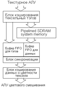 Ввиду того, что процесс чтения из SDRAM сопряжен с задержкой на 10 -12 тактов, необходимо реализовать раздельную работу блоков, работающих с тэгами и данными. Блок кэширования тэгов, показанный на Рис. 10 содержит полный набор тэгов для данных, которые поступят и будут кэшированы чуть позже, в блоке кэширования данных. Блок синхронизации производит временнОе выравнивание поступления данных о цвете текселя из SDRAM — с моментами подачи тэгов из блока кэширования. Текстурное арифметическое логическое устройство (Рис. 10) производит расчет адресов тексельных сэмплов и передает их в блок кэширования тексельных тэгов. Оно обеспечивает генерацию четырех адресов за такт, необходимых для осуществления билинейной фильтрации пикселя. Для трилинейного пикселя будет сформировано восемь адресов за такт. | ![]() Рис. 10 Архитектура кэш с раздельными конвейерами для тэгов и данных |