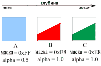 Рассмотрим пример, приведенный на Рис. 4. На нем представлены фрагменты из трех различных слоев, но принадлежащих одному и тому же пикселю на экране. Объект А имеет значение альфа 0.5 (полупрозрачен) и полностью покрывает пиксель, следовательно, значение маски для данного пикселя максимально и равно 0хFF. По завершению первого прохода слой будет содержать информацию о цвете объекта А, значении альфа и маске.