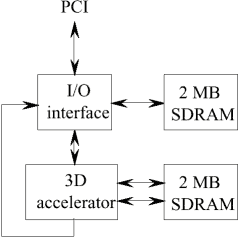 Реализация 3D ускорителя в виде самостоятельной и недорогой карты представлена на Рис. 11. Хранение текстур реализовано в модулях памяти SDRAM, непосредственно подключенной к микросхеме акселератора. К контроллеру ввода-вывода, обеспечивающему интерфейс с шиной PCI, также подключены модули памяти SDRAM. Они могут использоваться для хранения дополнительных текстур или информации о вершинах треугольников. Эти модули — элементы необязательные, но очень желательные, так как хранение текстур непосредственно на карте значительно снижает нагрузку на шину PCI при текстурировании. Локальное хранение вершин разгрузит шину в те моменты, когда просчитываемые треугольники пересекают границы тайла, ввиду того, что вершины будут загружаться на карту всего один раз. Более того, наличие такой памяти снижает нагрузку на PCI при повторных циклах обработки тайла внутри акселератора.