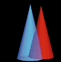 На Рис.6 показаны два конуса, рендеризованных с применением сглаживания. Визуальные артефакты, которые видны в месте пересечения голубого и красного конусов, являются результатом потери начальных значений маски и альфа, когда при послойном композиционировании методом front-to-back (от ближнего к дальнему) производится комбинирование альфа значения с коэффициентом охвата маски. Как утверждалось ранее в [2], используя сглаживание на основе значений альфа, корректно сгладить конуса невозможно.