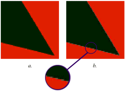 Рисунок 5a создан с учетом управляющего бита opaqueMask flag. Сцена содержит почти прозрачный слой (альфа очень близка, но не равна нулю), который покрывает черный непрозрачный треугольник, который, в свою очередь, расположен ближе идентичного белого треугольника. Фоном является непрозрачный красный слой. Рисунок 5b создан без учета значения бита управления opaqueMask. Обратите внимание на появившуюся светлую паразитную бахрому, которая явилась результатом отсутствия подрезки масок, принадлежащих белому треугольнику.