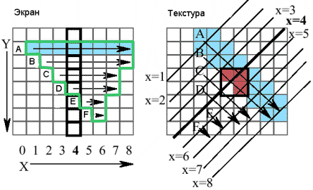 Использование "межлинейных" совпадений при сканировании треугольника показано на Рис. 9. Рисунок отображает связь между плоскостью экрана и текстурой, возникающую в процессе билинейной дискретизации треугольника. Координата × каждого последующего пикселя увеличивается на единицу вдоль линии сканирования (scanline). Так, линия А имеет начало Х=1 и заканчивается в Х=8. Приведенный на рисунке треугольник состоит из 6 линий (от А до F). Пересечения линий сканирования А-F с координатами × от 1 до 8 соответствуют единичным отсчетам (сэмплам) билинейной дискретизации. Тексели, необходимые для формирования линии А на экране, выделены. Красным цветом выделены тексели, соответствующие одновременно линии А в Х=4 и линии B в Х=4.