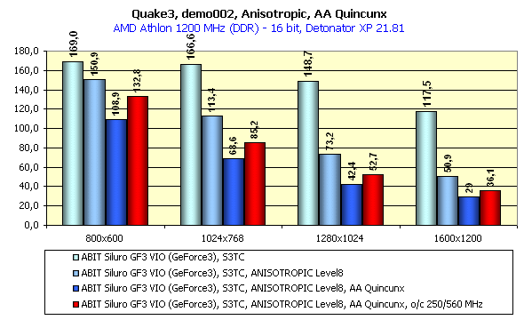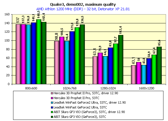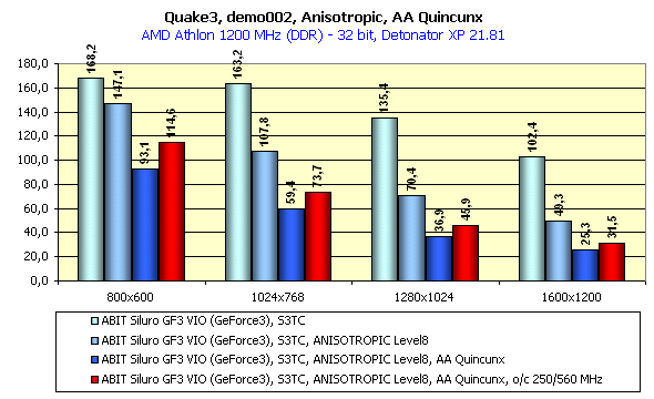 Начнем с 2D. Я лишь скажу, что все возможное по поводу этого аспекта качества работы видеокарт на базе GeForce3 уже многократно говорилось, поэтому желающие знать подробности могут почитать соответствующий раздел в обзоре MSI GeForce3-карты с VIVO. К ABIT Siluro GF3 VIO я никаких нареканий в этом плане не имею.