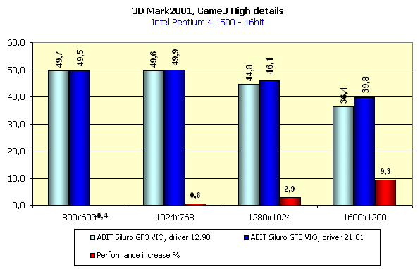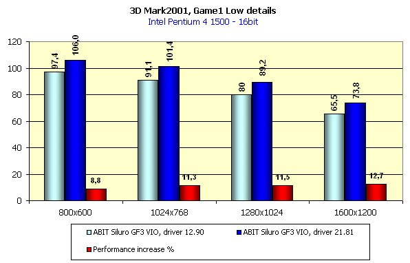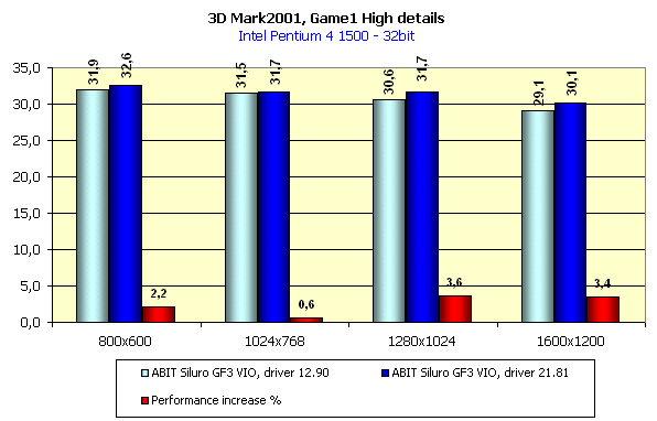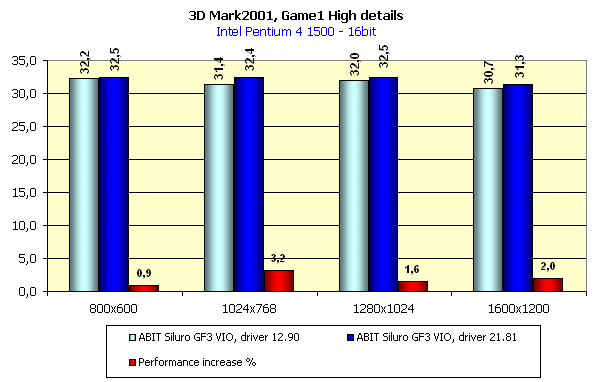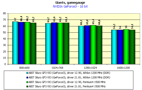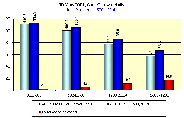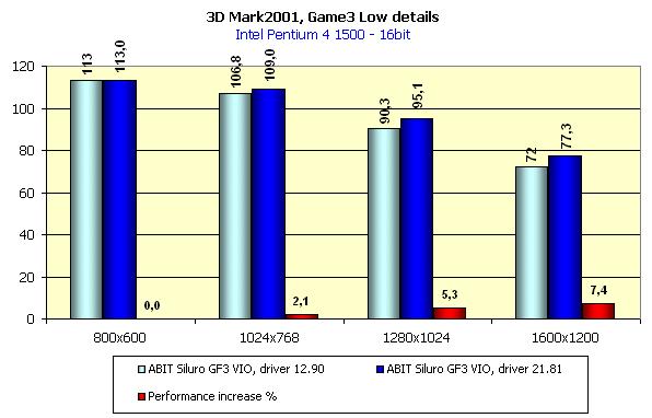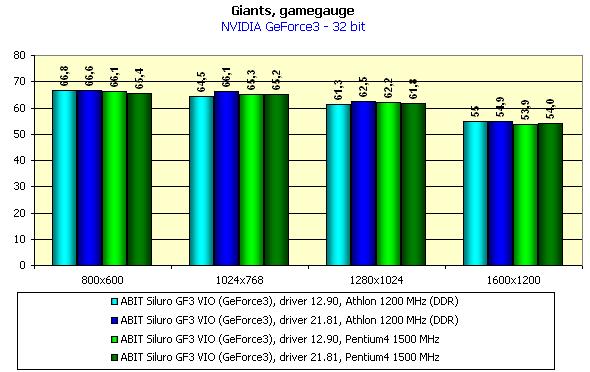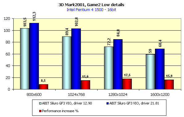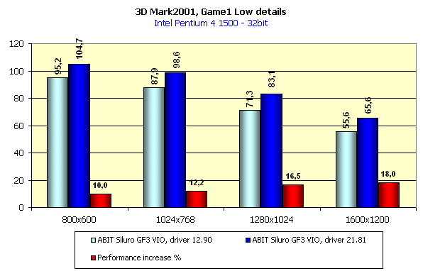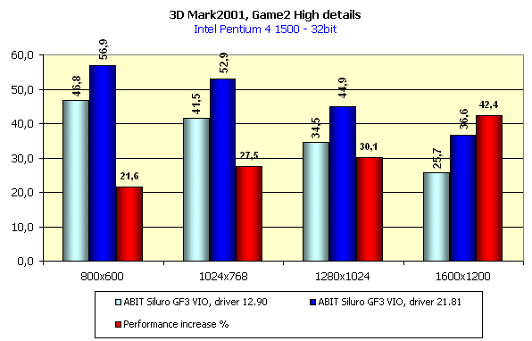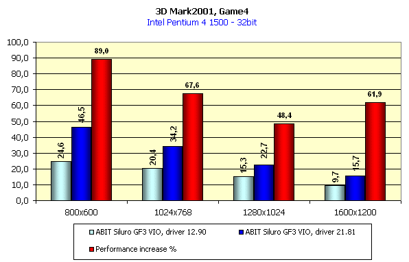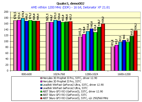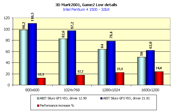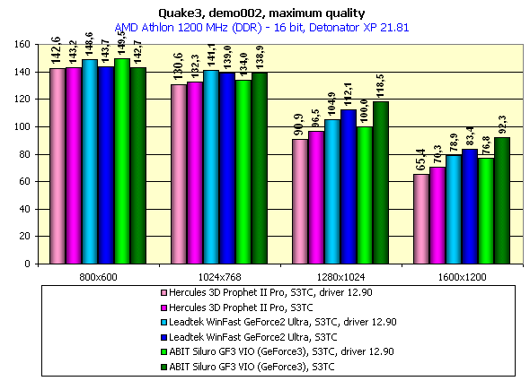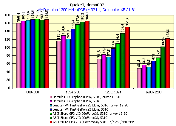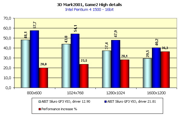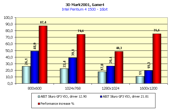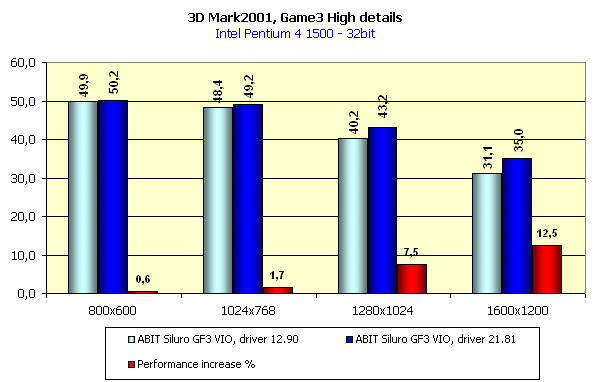 Наглядно видно, что прирост производительности от использования драйвера 21.81 имеется, и у GeForce3-карты он наибольший. Особенно хорошо это заметно в 32-битном цвете.