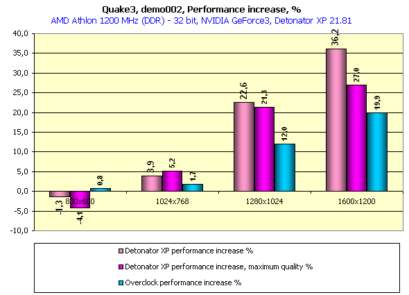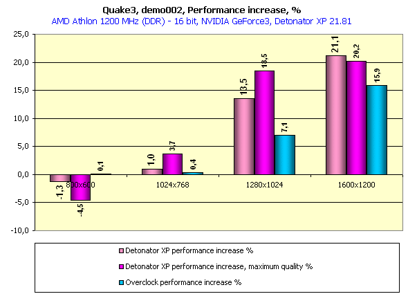 Тенденция увеличения роста производительности при повышении разрешения явно просматривается. Для интересного сравнения я привел еще прирост по скорости от разгона (с 200/460 до 250/560 МГц). Как видим, если смотреть на процентные исчисления, то новый Детонатор дает дивидендов больше, чем разгон. Обещанная оптимизация нового драйвера налицо.