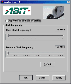 Компания ABIT поставляет с видеокартой драйверы, базируемые на эталонных от NVIDIA и лишь внешним видом слегка отличающиеся от последних. Поэтому я не стану акцентировать внимание на этом программном обеспечении, благо на сайте iXBT есть статьи, посвященные особенностям "Детонаторов" от NVIDIA. Некоторого внимания заслуживает утилита Graphics MAX, которая отвечает за разгон частот работы платы. Однако кроме этих функций (а в эталонных драйверах они и так имеются), в Graphics MAX ничего особенного нет.