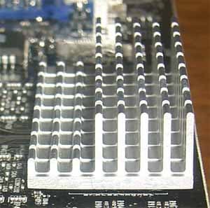 Как можно видеть, радиаторы на микросхемах памяти представляют собой два комплекта: большой и малый. Большой комплект — это два игольчатых радиатора. Малый комплект состоит из пары пластинчатых радиаторов. Каждый из радиаторов "покрывает" собой две микросхемы памяти.