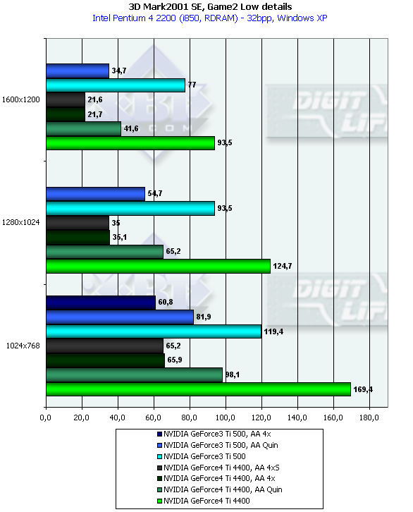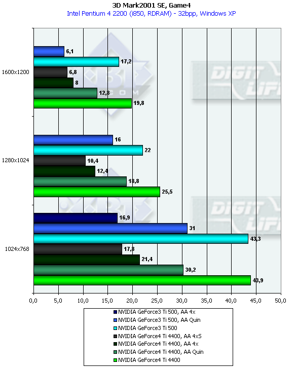 Этот тест является чем-то вроде среднего между двумя предыдущими, и, как видим, картина весьма схожа с той, что мы видели в Game2, с небольшим плюсом в сторону Ti 4400.