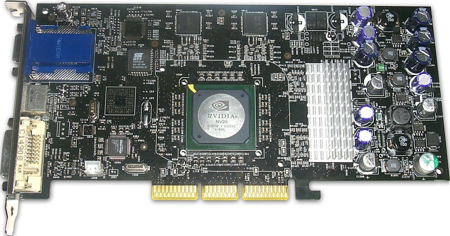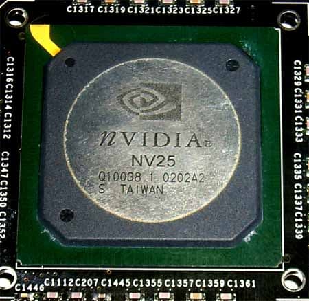 А вот и сам GPU (ревизия А2). Отметим, что на нем нанесено кодовое наименование NV25, кроме того, стоит обратить внимание на на дату выпуска этого чипа — начало 2002 года. Напомню, что уже стали появляться в продаже карты, имеющие чипы ревизии А3 и с официальной маркировкой.