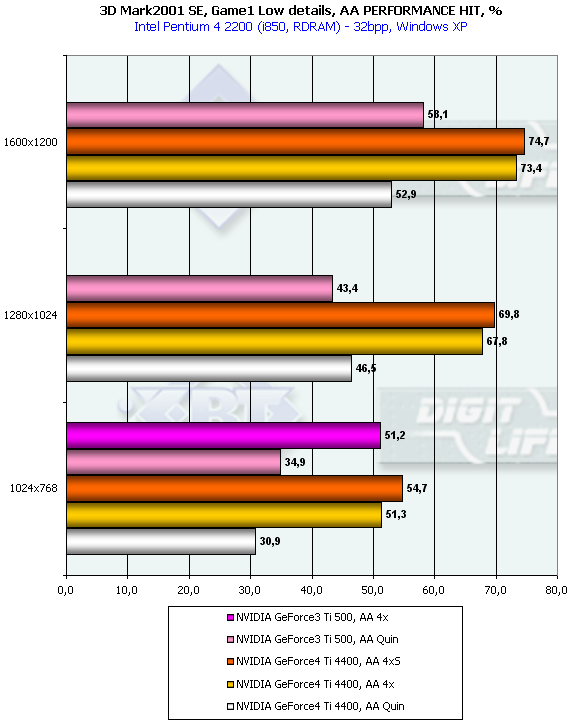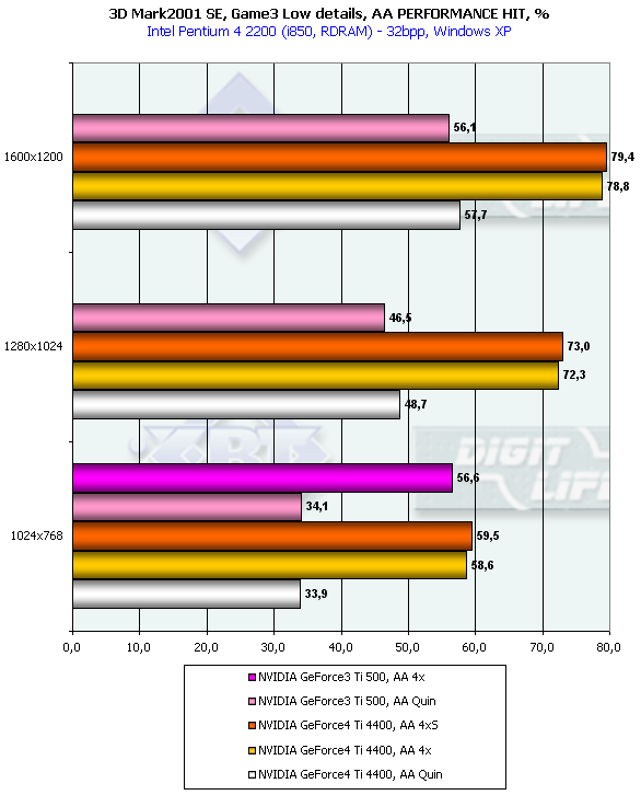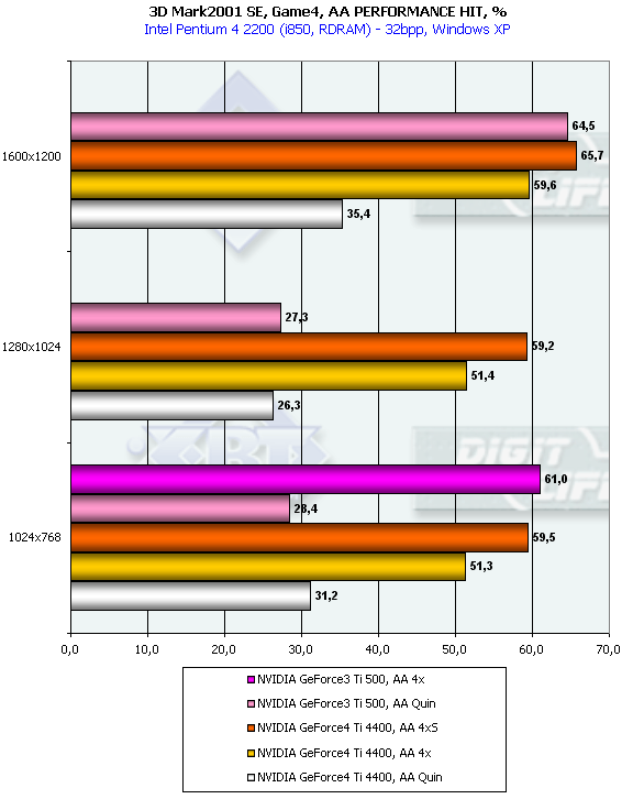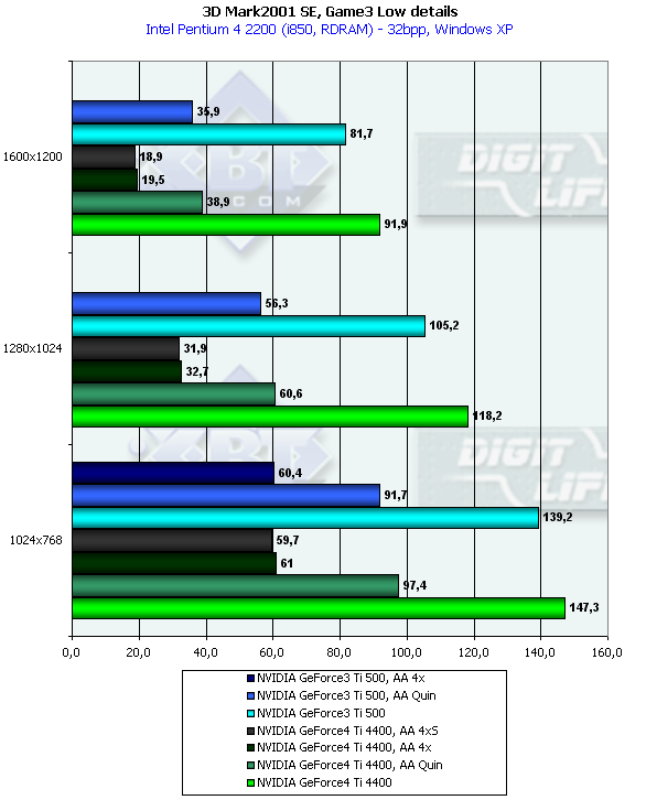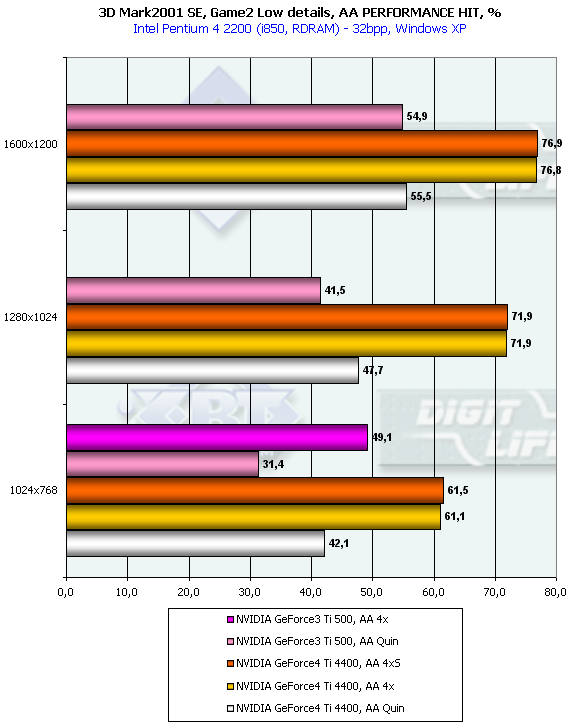 Интересно отметить, что данный тест продемонстрировал более сильное падение производительности у Ti 4400 при АА Quincunx, нежели у Ti 500. Вспомним, что Game2 отличается от остальных тестов 3DMark2001 тем, что имеет большой коэффициент перекрытий Overdraw, поэтому крайне важно, чтобы в этом тесте хорошо работали механизмы отсечения невидимых поверхностей. Глядя на разницу в производительности между картами при АА и без него, можно предположить, что эффективность HSR у Ti 4400 падает при активизации АА более сильно, чем у Ti 500.