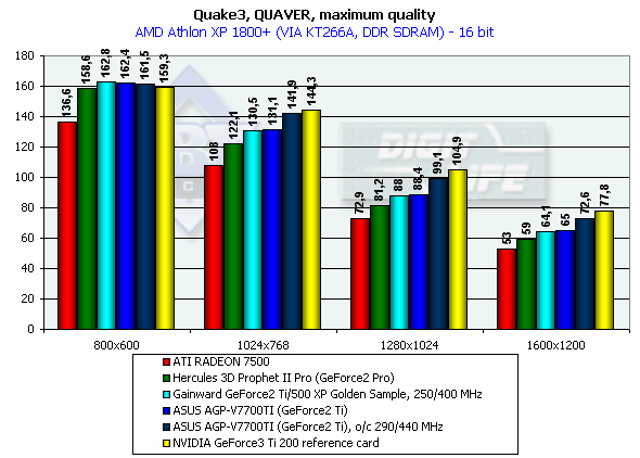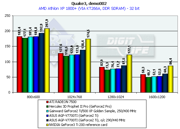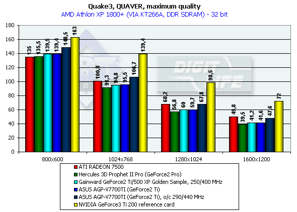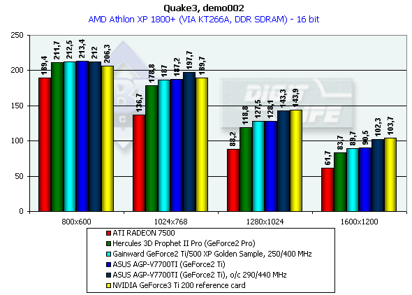 Ну а в стане карт на GeForce2 Ti все как положено: сильное опережение соперника в лице ATI RADEON 7500 (290 МГц) в 16-битном цвете и примерное равенство в 32-битном. Если обратить внимание на цены, то мы можем увидеть примерный паритет между стоимостью полноценного (290 МГц) ATI RADEON 7500 и ASUS AGP-V7700TI Deluxe. И снова выбор за пользователем, хотя в данном случае уже шансы у RADEON 7500 выше.