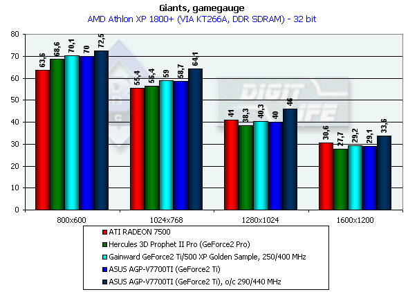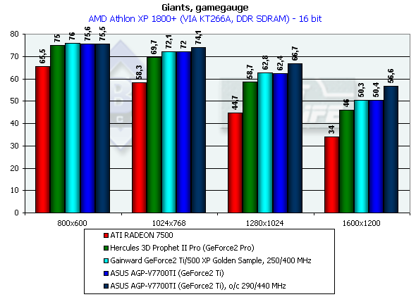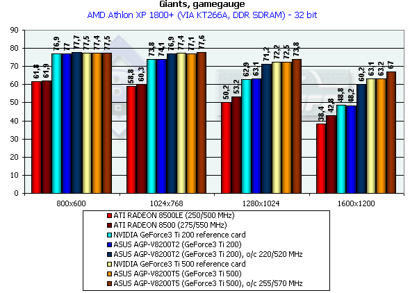 - Giants v.1.398 (Planet Moon Studios/Digital Mayhem/Interplay) игровой тест, демонстрирующий работу платы в Direct3D с использованием стандартного демо-бенчмарка gamegauge в режиме максимального качества.