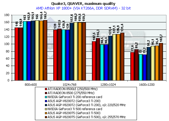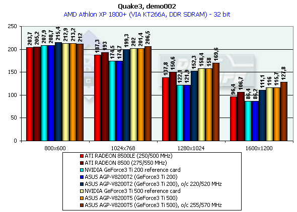 Что касается 2D, то скажу, что к ASUS AGP-V8200T2/T5 замечаний у меня не было при работе в разрешении 1600x1200 при 75 Гц (при 85 Гц ревизия Deluxe чуть ухудшила качество картинки). А вот карты на GeForce2 Ti с таким разрешением даже при 75 Гц уже явно не справились, и только в 1280х1024 при 85 Гц и даже 100 Гц можно было получить приемлемый комфорт при работе с графикой.