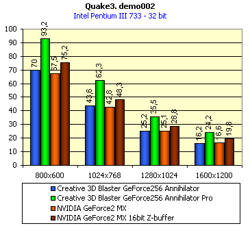 Предваряя результаты, хочу сразу отметить, что обе карты показали совершенно одинаковую производительность, отличия были настолько незначительными, что нет никакого смысла на диаграммах показывать обе платы, поэтому ниже представлены результаты ASUS AGP-V7100/DVI.