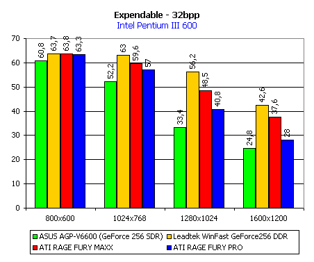 И снова дает о себе знать у ATI RAGE FURY MAXX оптимизация под 32-битный цвет, выведя эту карту на второе место после NVIDIA GeForce 256 с DDR-памятью.
