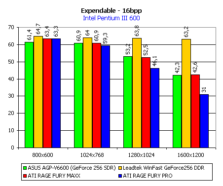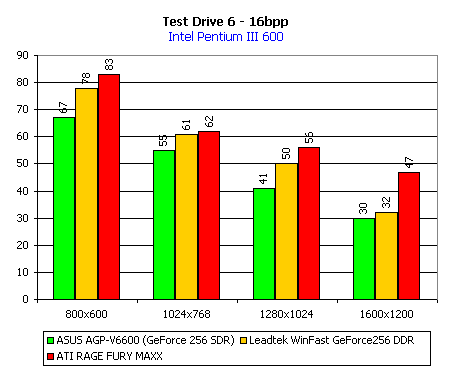 Как можем видеть, в 16-битном цвете ATI RAGE FURY MAXX никак себя не проявила, отстав от конкурентов по всем разрешениям, хотя показав достаточно приличные результаты.