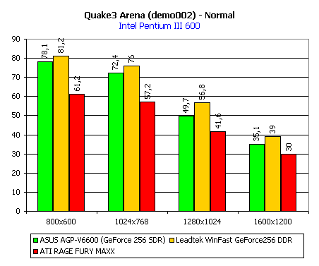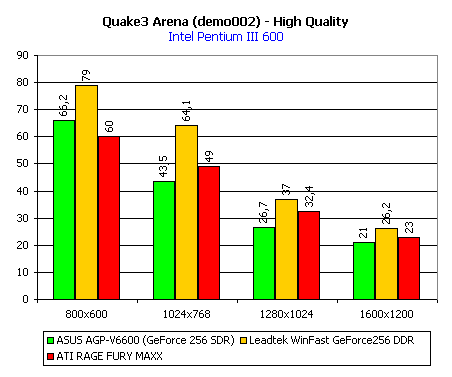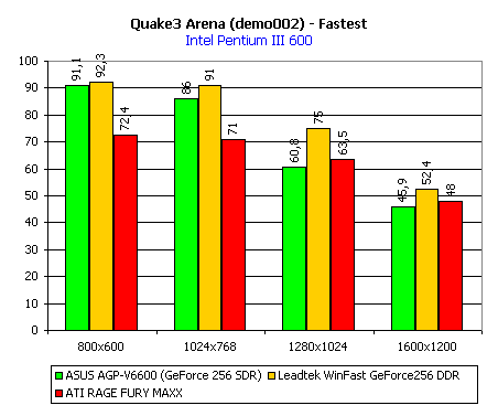 Любопытно отметить, что на высоких разрешениях ATI RAGE FURY MAXX догоняет ASUS AGP-V6600.
