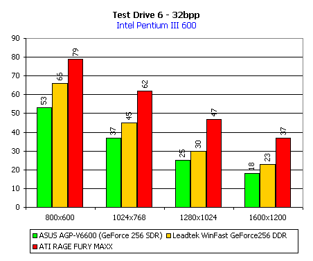 Ну просто нет слов! Блестящая победа ATI RAGE FURY MAXX! К тому, что я сказал выше (качественная поддержка SSE) надо добавить еще оптимизацию этой карты под 32-битный цвет — и вот он, непревзойденный успех.