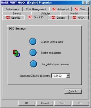 На этой закладке всего четыре настройки. Пользователь может отключить Vsync, включить anti-aliasing (эффект сглаживания). Также имеется возможность включить поддержку палетизированных текстур (то есть текстур, в которых для определения цвета используется палитра), что бывает важно для некоторых игр. И наконец, имеется выбор глубины Z-буфера.